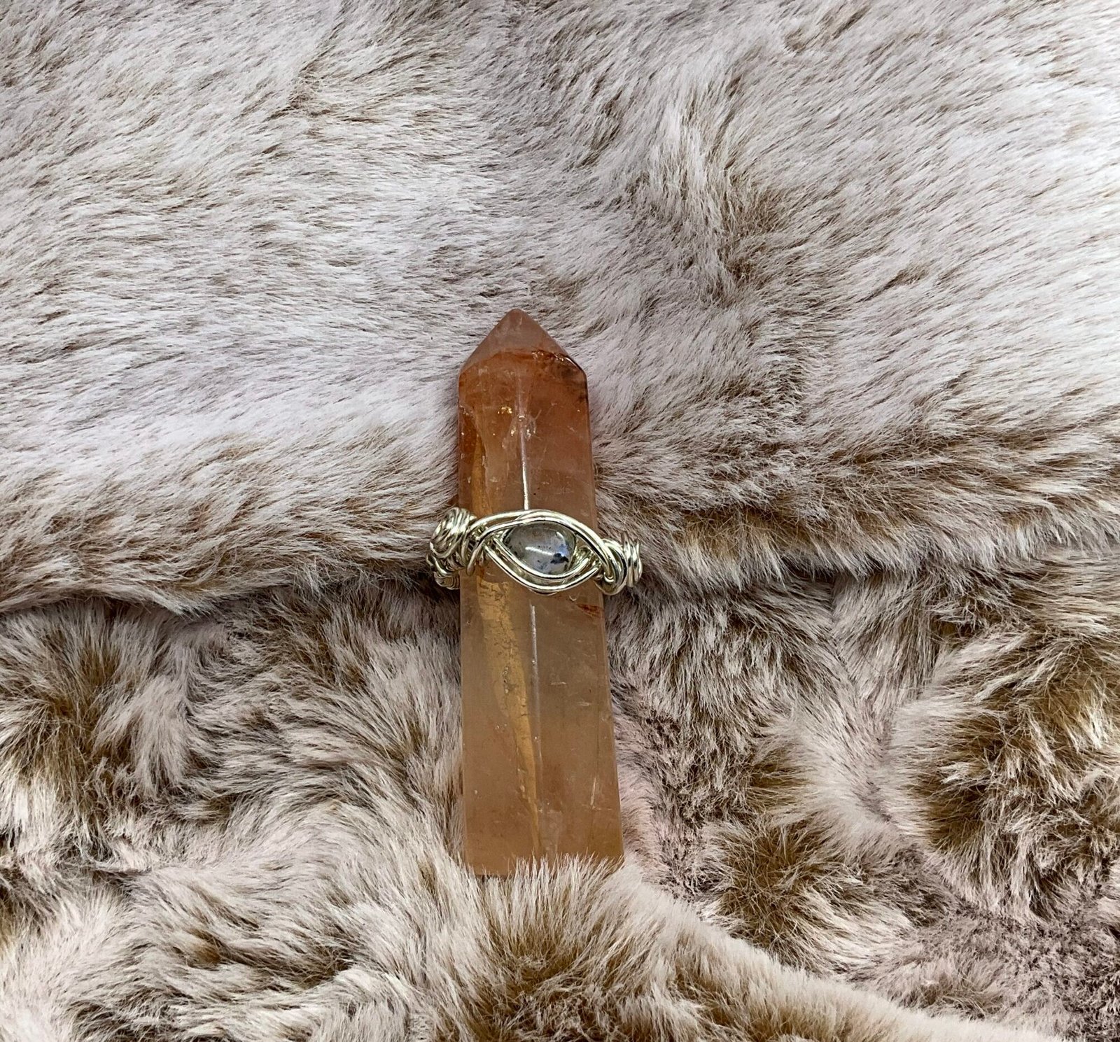 This exquisite ring features a luminous Moonstone cabochon, known for its captivating adularescence – that mysterious inner glow that mimics moonlight. It’s delicately embraced by an intricate Sterling Silver wire-wrapped setting, designed to highlight the stone’s natural beauty.