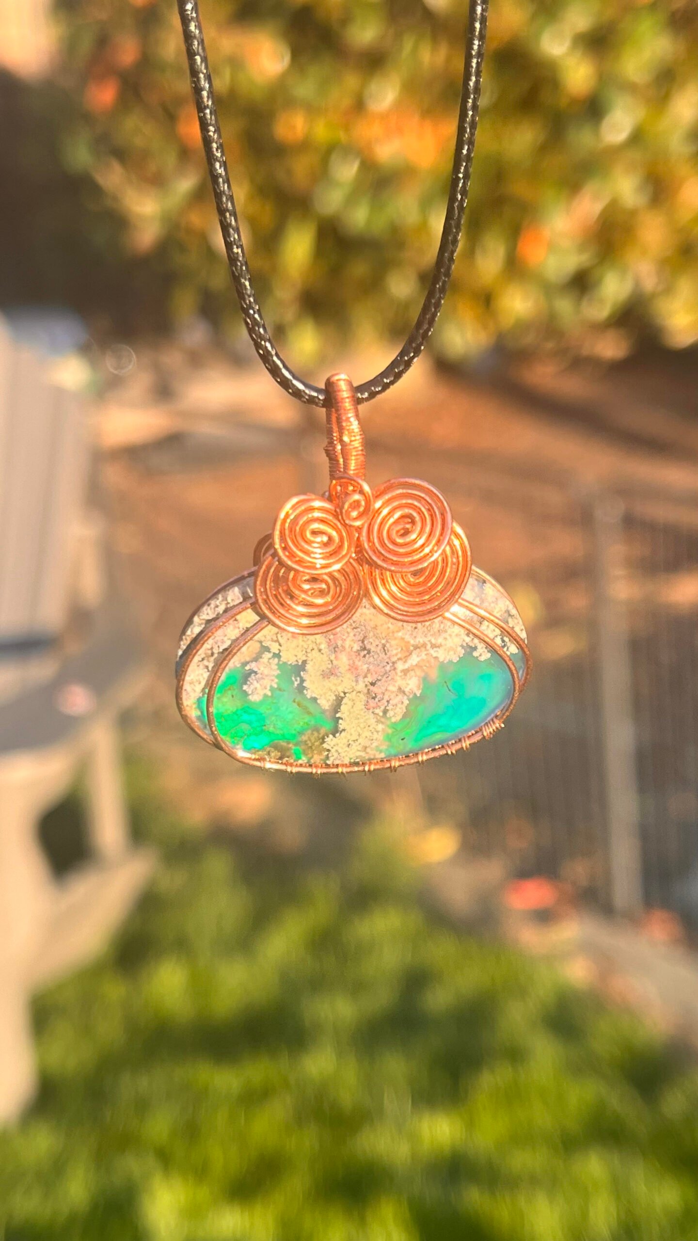 Behold this captivating moss agate, lovingly wrapped in antiqued copper wire to resemble a miniature witch’s cauldron! ✨