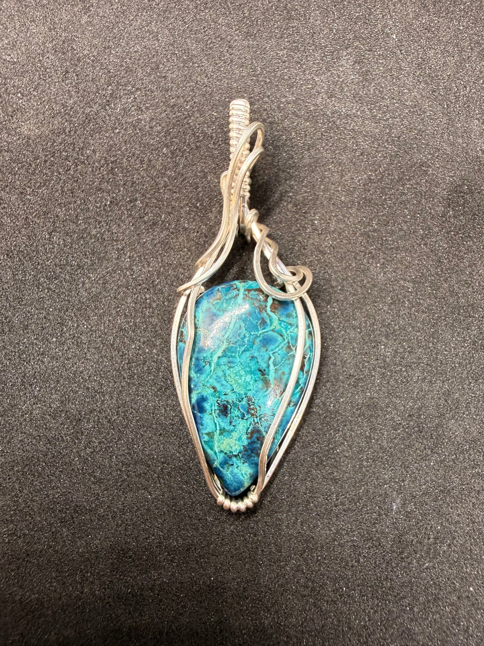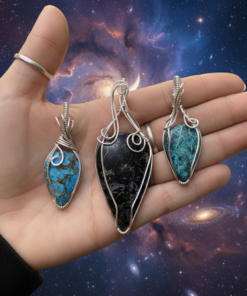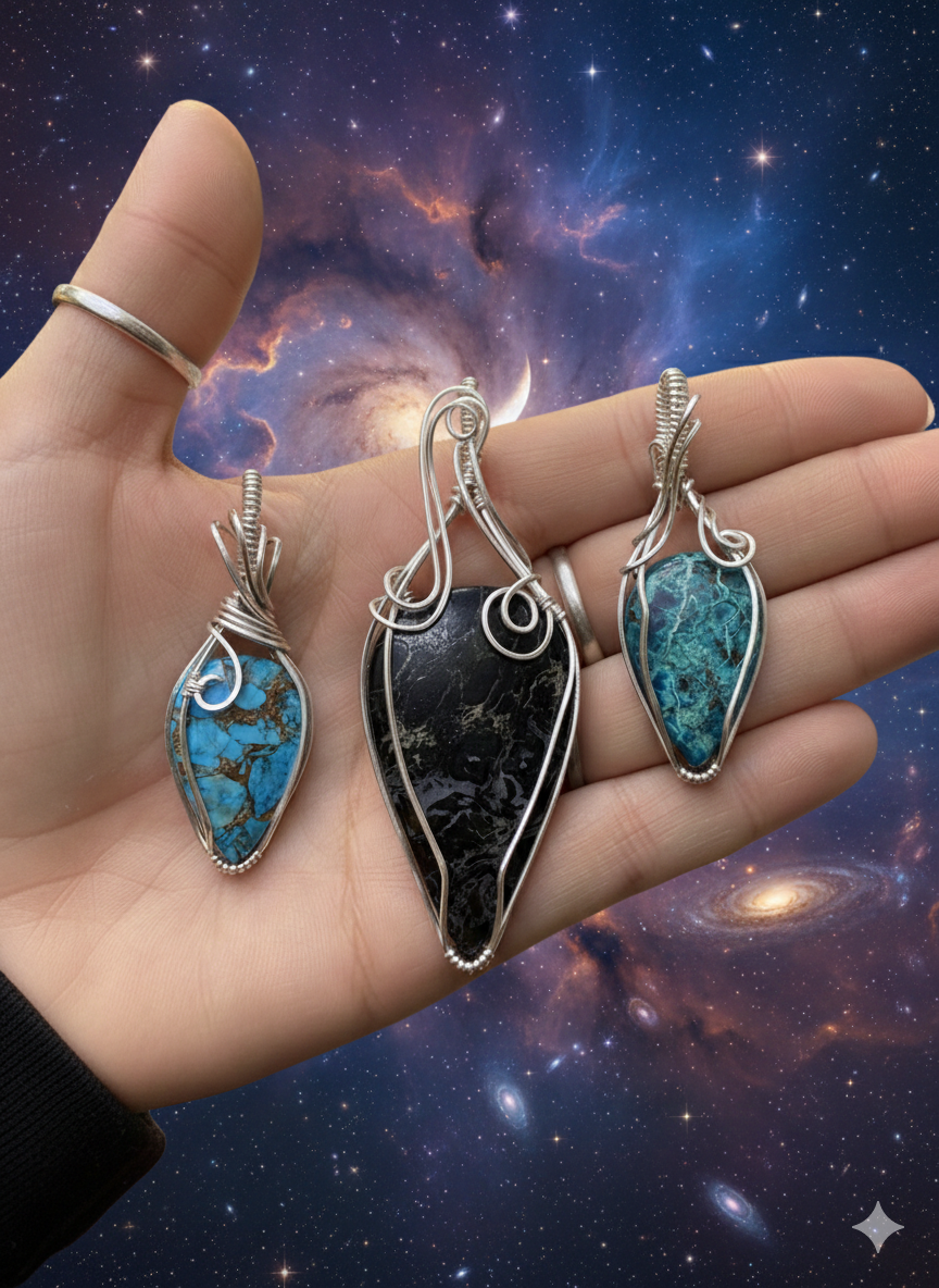 Deep blues, earthy greens, and the shimmering silver of a moonlit wing. This Chrysocolla pendant feels like a fragment of a distant nebula captured in sterling silver.
