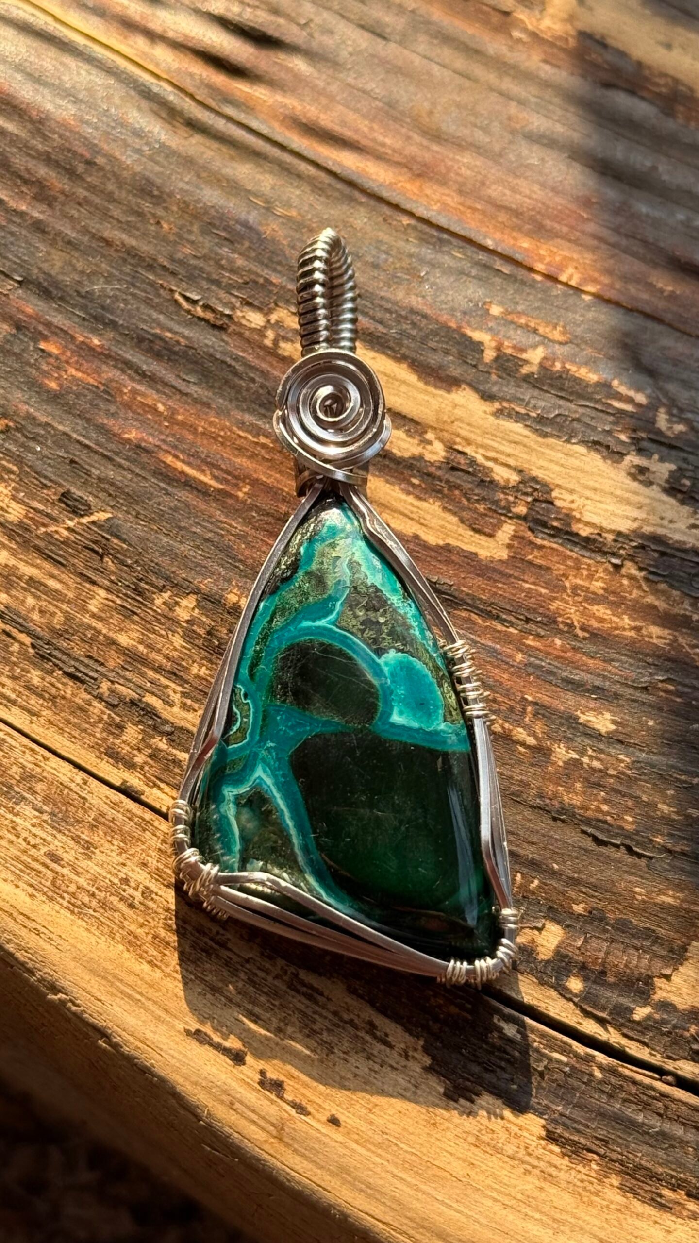 Natural Chrysocolla Malachite Pendant – Titanium Wire Wrapped – Handmade in the Hoh Rainforest